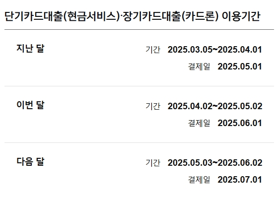 그럼 저도 임의로 결제일을 지정하여 조회해보겠습니다. 결제일을 2025년 6월 1일로 설정해보았는데요, 일시불/할부 이용기간과 단기/장기카드대출 이용기간은 다음과 같이 나왔습니다.