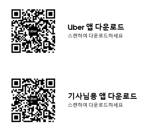 모바일 어플리케이션을 활용하시면 더 쉽고 간편한 이용이 가능합니다. 구글스토어 또는 애플스토어에서 검색하시거나, 위 그림의 QR코드를 스캔하여 Uber 앱과 기사님용 앱을 다운받을 수 있어요.