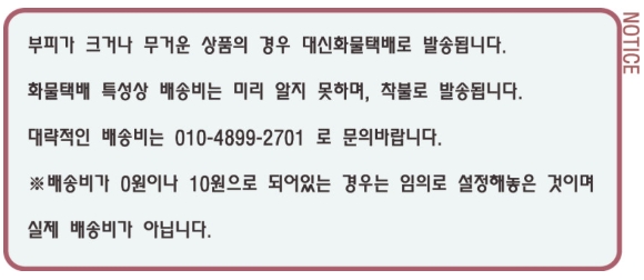 배송과 관련된 공지사항 및 연락처에 대해서는 위 그림의 내용을 참고하세요. 문의전화는 밤 11시까지만 가능하고, 섬이나 제주도 지역의 택배비는 항공료가 별도로 추가됩니다. 단순변심으로 인한 반품 시에는 무료 배송비를 포함한 왕복 배송비를 구매자가 부담해야 합니다.